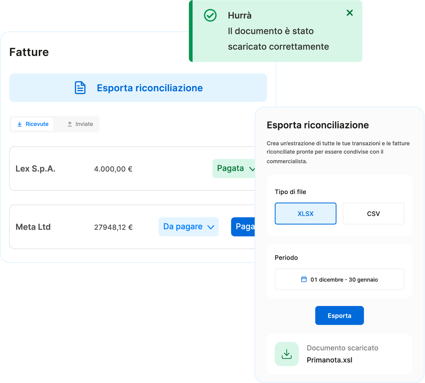 Dimentica le serate trascorse al computer per ritrovare tutte le fatture. Con Tot effettui la riconciliazione automatica ed esporti un file Excel precompilato con un semplice click.